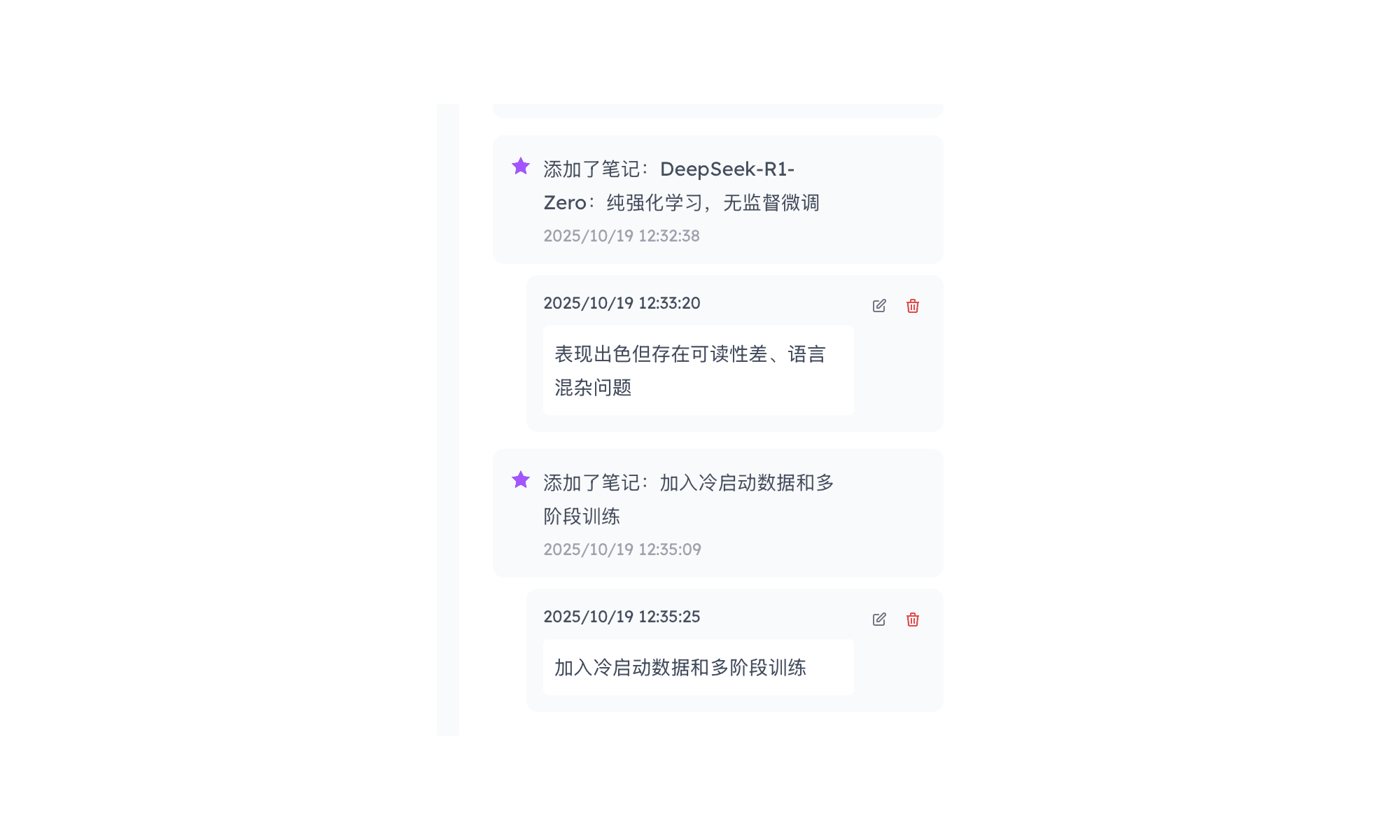 支持对任何 AI 生成内容添加个人笔记和评论,记录思考过程,建立个人化的知识注释体系,让学习更有深度。